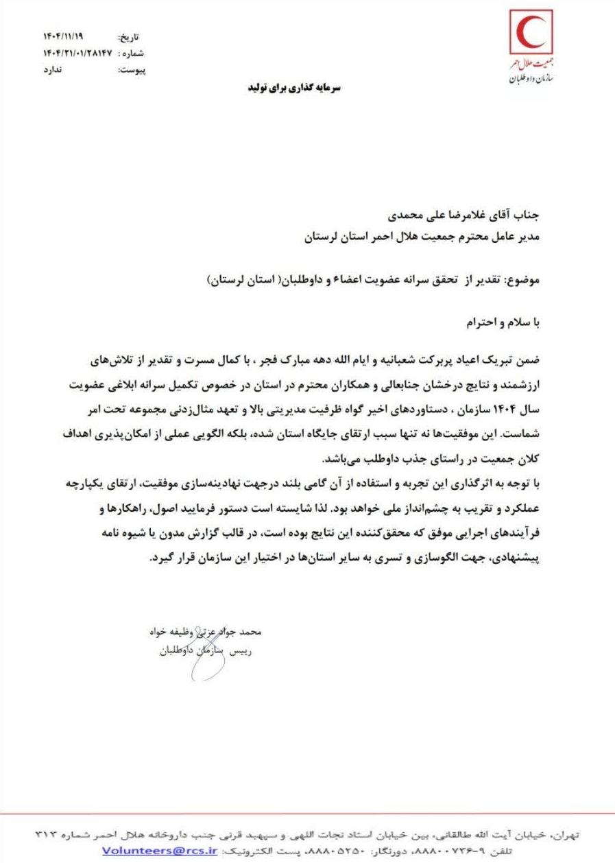 در این نامه با اشاره به تلاشهای ارزشمند، برنامهریزی دقیق و همت بالای کارکنان، اعضا و داوطلبان جمعیت هلالاحمر لرستان، تحقق سرانه ابلاغی عضویت بهعنوان یک دستاورد مهم سازمانی مورد تأکید قرار گرفته است.